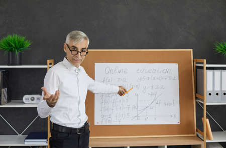 Teacher having online class. Portrait of intelligent smart mature man in glasses standing in front of classroom board, pointing at it, looking at camera and asking question during virtual math lesson