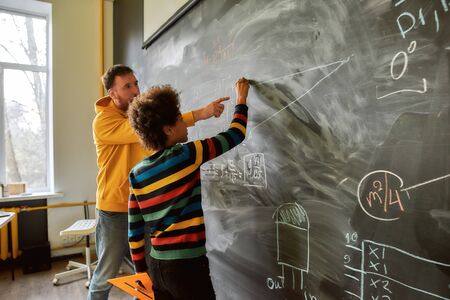 The great aim of education is not knowledge but action. Young male science teacher explaining main rules and formulas in physics and mechanics. A boy is drawing on the blackboard