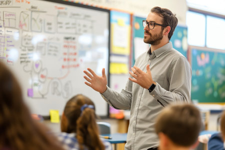 Teacher explaining a concept on a whiteboard in a classroom, bright natural light, engaged mood. Man interacting with students, blurred background. Generative AI