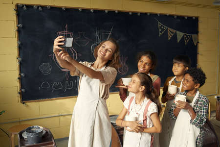 Smiling young pottery teacher taking selfie with multi-ethnic kids posing with clay mugs made at pottery class
