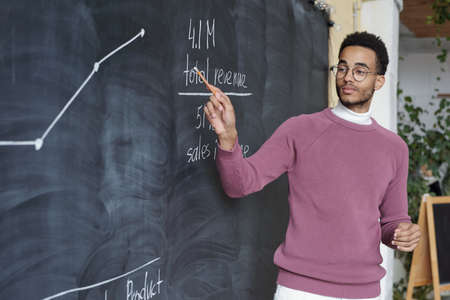 Young confident teacher of economics pointing at graph on blackboard while explaining it to colleagues at seminar