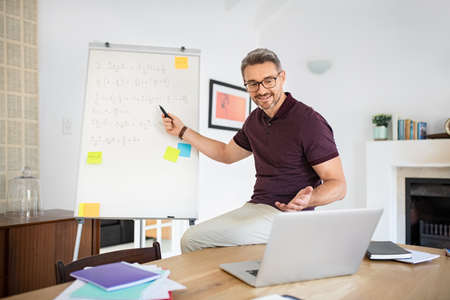 Mature teacher having online class through video call and explaining maths. Happy mature math professor teaching students using whiteboard and laptop on video conference. Teacher teaching students maths on video call at home: e-learning via interactive platform.