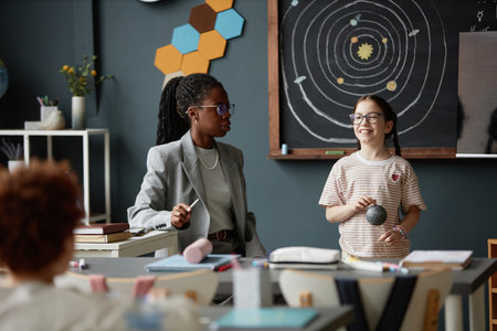 Black woman teacher interacting with Caucasian girl student holding model planet in science classroom, both standing near desk with solar system diagram on chalkboard in background