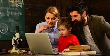 Education and learning people concept - little student boy and Teacher. Young adult concept. Happy family. Parent Teacher. Daddy Teacher. First day in school.
