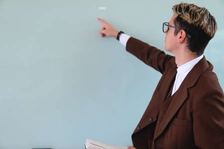 Teacher looking at the whiteboard. Blond Caucasian elegant man dressed as a teacher. Elegant man giving class. High quality photo