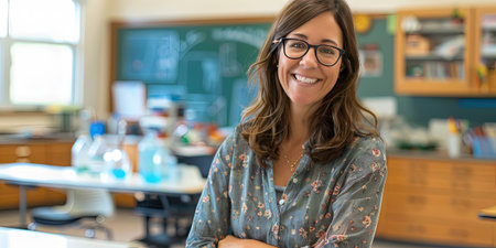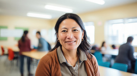 This portrait features a smiling female teacher in her 50s, exuding warmth and professionalism in a dynamic classroom environment, encouraging student engagement and learning.