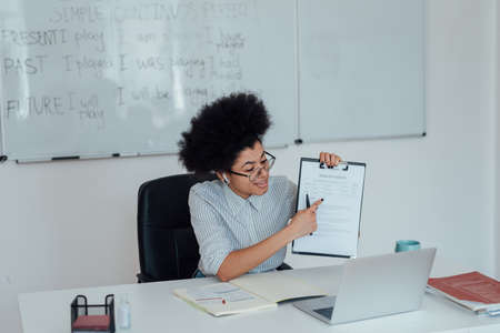 Never stop learning. Young afro american female teacher sitting at her workplace at home and explaining rules of English grammar while teaching online