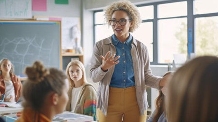 Female Teacher standing by a whiteboard in a lively classroom. AI generative