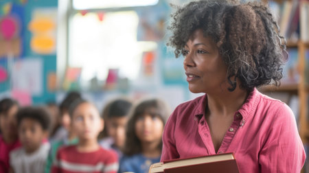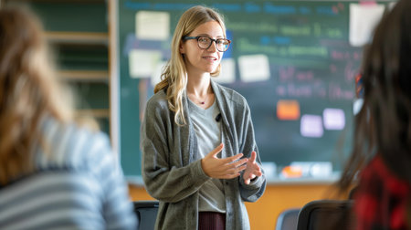 A cheerful female teacher stands confidently in her classroom, fostering a supportive environment to inspire young students in their learning journey.