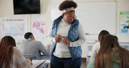 Education, teacher and students in classroom, woman and knowledge with assessment, exam and learning. People, educator and youth with academy, smart and test with intelligence and research project