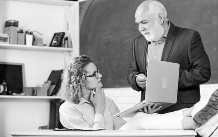 Modern school. Teaching private lessons great way share knowledge. Man mature school teacher and carefree girl student with laptop. High school college university. Communicate clearly and effectively