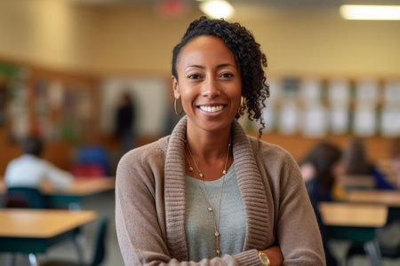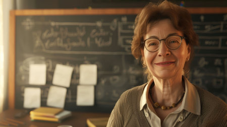 Inspiring and Beautiful Female Teacher with a Captivating Smile in a Warmly Lit Classroom Setting