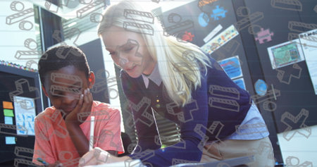Image of mathematical symbols over caucasian female teacher teaching african american schoolboy. national teacher day and celebration concept digitally generated image.