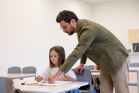 Man primary school teacher in classroom with girl pupil.