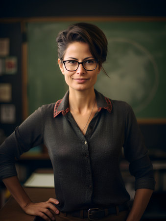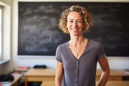 Cheerful female teacher in cozy clothing stands confidently in front of a chalkboard in a classroom, symbolizing education and warmth.