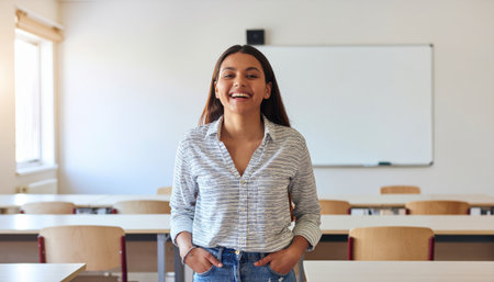 Close-Up of Teacher in Classroom, Beaming with Smile