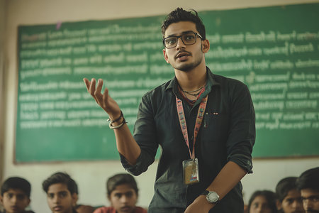 Young indian male teacher giving a presentation to his students in classroom