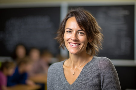 portrait of a kind female Montessori kindergarten teacher in a kindergarten with children, slight smile, candid
