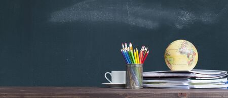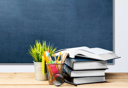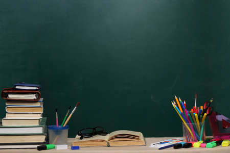 Back to school concept. School supplies on wooden table and blackboard background