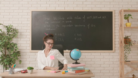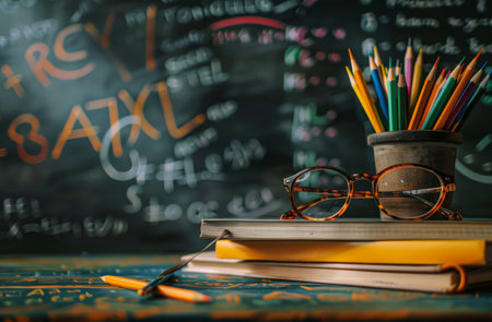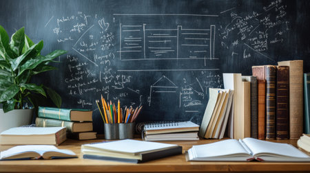A classroom desk features stacked books and a cup of colorful pencils, with mathematical and scientific diagrams written on the chalkboard in the background, suggesting an educational environment.