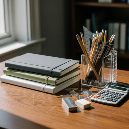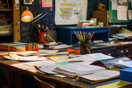 A desk with a notebook, pencils, and a cup of tea. The desk is cluttered with various items, including a book, a cup, and a pencil. The scene suggests a place of work or study