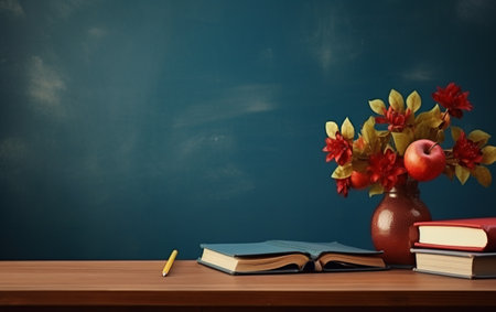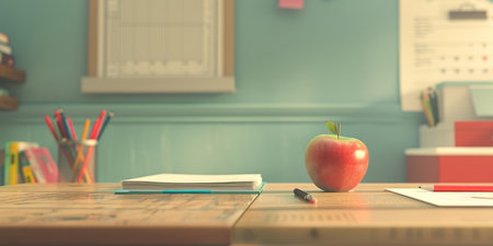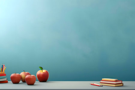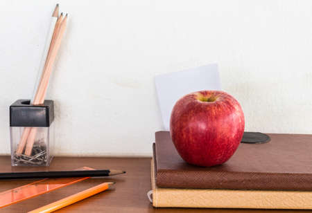 Classroom still life with apples, books and pencils.