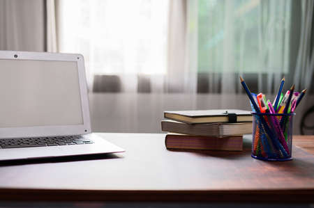 Notebook computer, books at the desk