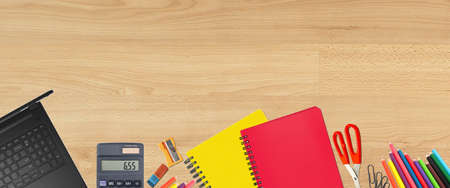 Office supplies on a wooden table. Back to school. Copy space.