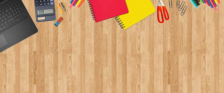 workplace desk top angle view laptop book and office supplies knowledge education learning concept flat horizontal vector illustration