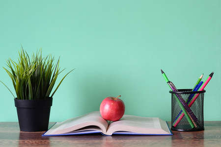 Back to school, stationery, notebook, apple on table, home learning concept, part of kids room interior