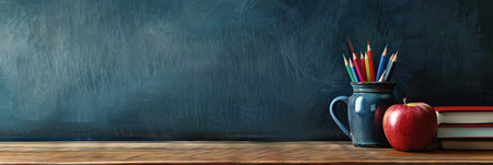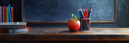 Bright pencils stand in a glass next to a shiny red apple and stacked books on a dark classroom desk, evoking a warm and inviting learning atmosphere.