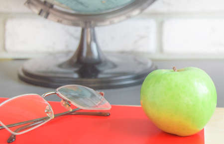 World teachers' Day in school. Still life with books, globe, Apple, glasses selective focus.