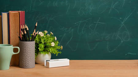 Education or back to school concept. books, pencils, mug, white stabler, plant on wooden board over green blackboard background.