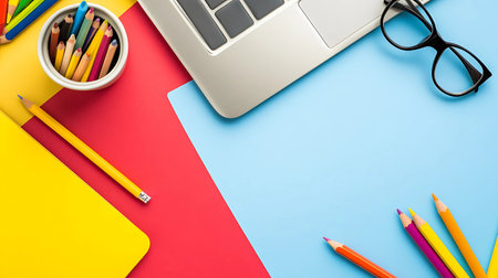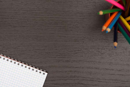 Office table with notebook and pencils. View from above with copy space.