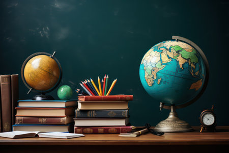 Wooden desk with books, globe and pencils on turquoise background
