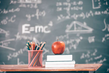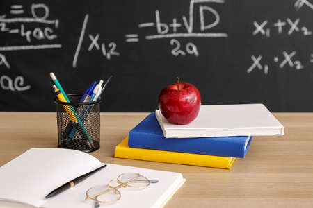 Apple with books, pen cup and eyeglasses on table near blackboard