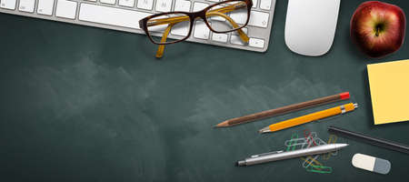 keyboard, glasses, and pens on blackboard background