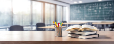 Back to school concept with books, pencils and stationery on wooden desk in classroom