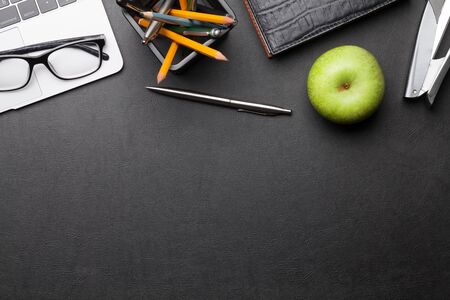 Office desk table with laptop, supplies and apple. Dark workspace tabletop with copy space. Top view flat lay