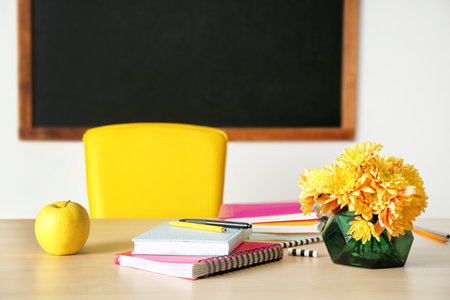 Bouquet of flowers, apple and notebooks on table in classroom. teacher day celebration