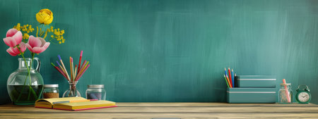 Classroom background concept, Back to school background with accessories and copy space on wooden table against green chalkboard background.