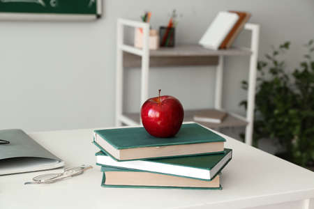 Laptop, books and apple on teacher's table in classroom