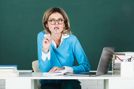 Portrait of teacher in eyeglasses sitting at her desk and looking at camera during lesson in the classroom