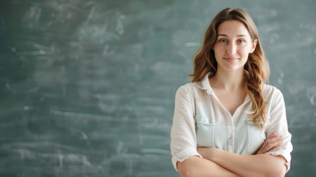 A young female teacher confidently stands in a classroom with arms crossed, embodying intelligence and dedication. Behind her, a chalkboard sets the academic scene in a learning environment.
