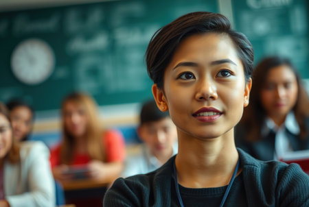 Happy teacher enjoys connecting with her students in a bright classroom setting during lessons.