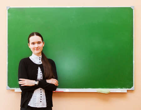 copy space. back to school. empty blackboard. Formal informal and nonformal education. girl teacher at school lesson. happy student with glasses at blackboard. new school year. Girl prepare for exams