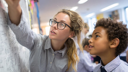 Generative AI : Smart woman teacher in glasses helping students to to schoolwork during lesson in light classroom at school