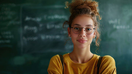 A woman stands confidently in front of a chalkboard, possibly a teacher in a classroom setting.