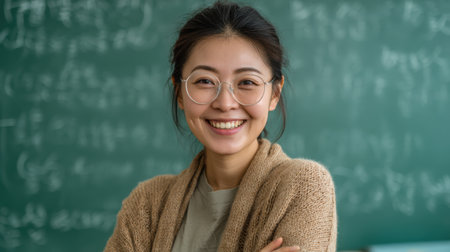 A professional Asian woman teacher teaching in front of a chalk-filled green board, casual classroom, warm and friendly mood