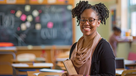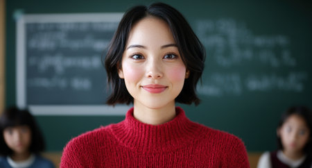 Cheerful female teacher in cozy clothing stands confidently in front of a chalkboard in a classroom, symbolizing education and warmth.